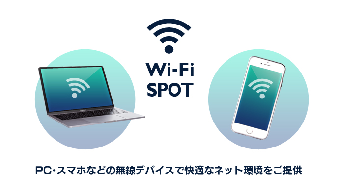 PC・スマホのデバイスで快適な無線ネット環境をご提供。Wi-Fiスポットサービスは、オフィス・敷地内など無線電波が届く範囲であれば、PC・スマホなどの無線デバイスで場所を問わずネットワークに接続することができます。また、店舗を営まれている法人様におかれましては、公衆Wi-Fiとして顧客の呼び込みにもご活用いただくことができます。