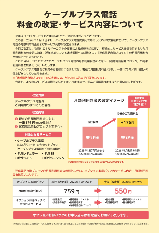 この度、2026年1月1日より、ケーブルプラス電話の提供元であるJCOM株式会社において、ケーブルプラス電話の月額利用料金およびサービス内容が改定されます。