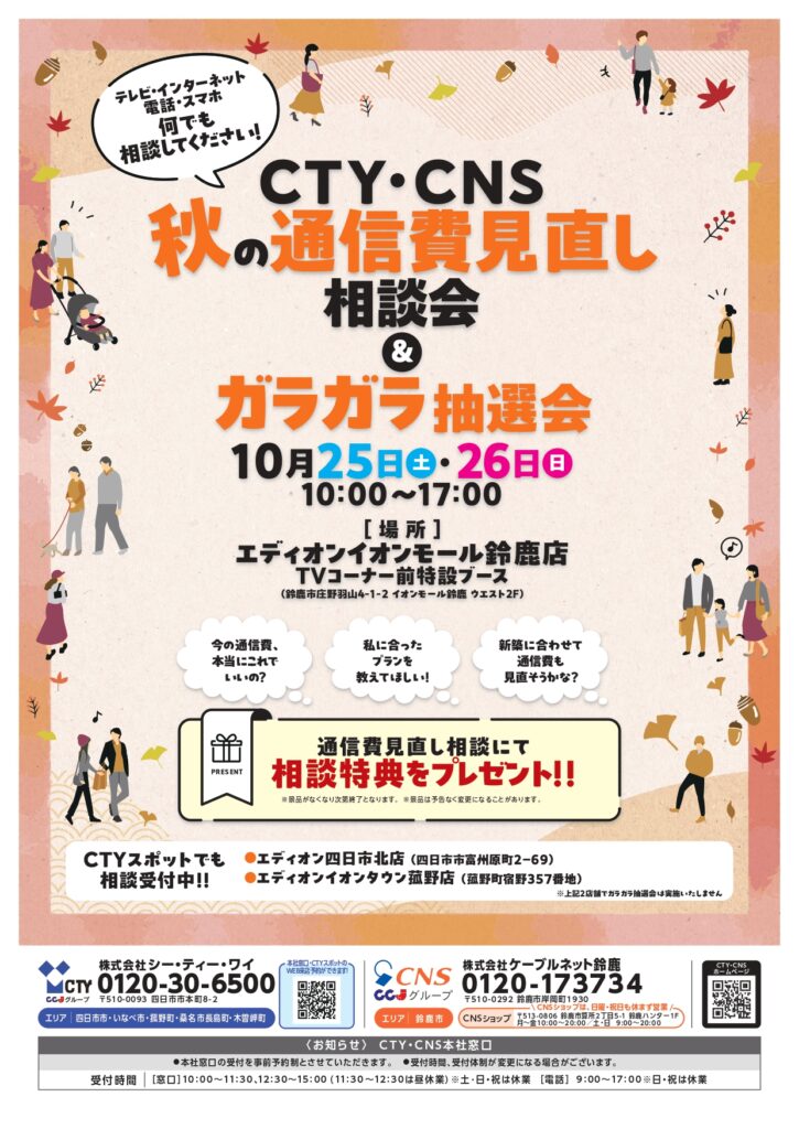 CTY・CNSではそんなお客様の悩みにお答えするため、「秋の通信費見直し相談会」を開催いたします。