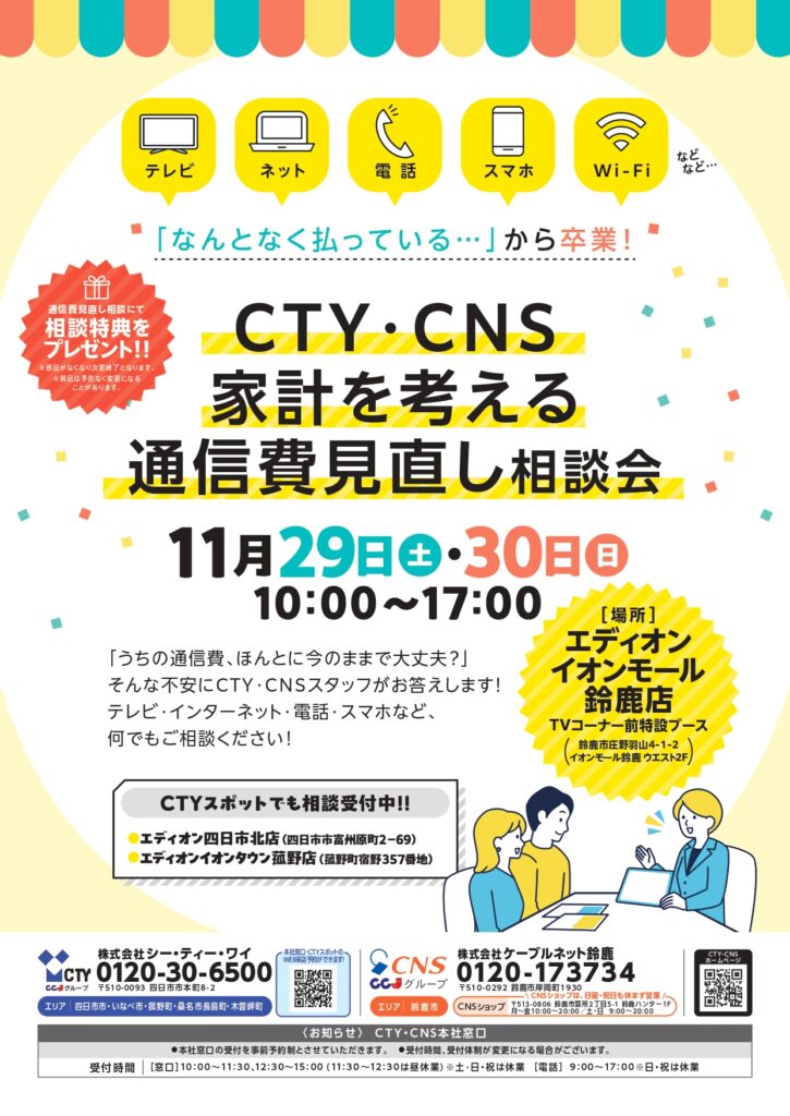 「家計を考える通信費見直し相談会」ではCTY・CNSスタッフがあなたの通信費をチェックし、家計にやさしいプランを一緒に考えます!